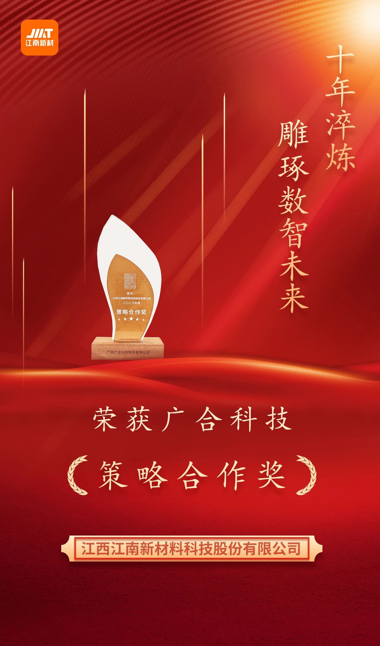 在廣合科技(001389)首次公開發(fā)行A股上市晚宴暨10周年慶典上,廣合科技授予江南新材“策略合作獎”,這份獎項是對江南新材與廣合科技長期穩(wěn)定合作關(guān)系的認(rèn)可,更是對未來合作發(fā)展的信任與期許!躬逢榮耀,與有榮焉!江南新材深深感恩并倍感珍惜在里程碑式的時刻收獲廣合科技授予的獎項!