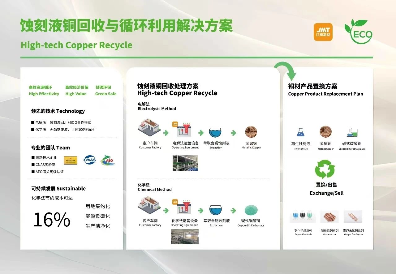 江南新材始終在綠色制造上投入研發(fā),可根據(jù)下游PCB客戶工廠的實(shí)際情況,為客戶量身定制含銅蝕刻液回收再利用項(xiàng)目,實(shí)現(xiàn)對(duì)銅資源進(jìn)行更高效的轉(zhuǎn)化循環(huán)。該項(xiàng)目作為江南新材在供應(yīng)鏈上的增值價(jià)值服務(wù),不僅可以促進(jìn)行業(yè)的綠色轉(zhuǎn)型與環(huán)境的持續(xù)改善,更可幫助客戶實(shí)現(xiàn)資源循環(huán),創(chuàng)造更大資源價(jià)值。